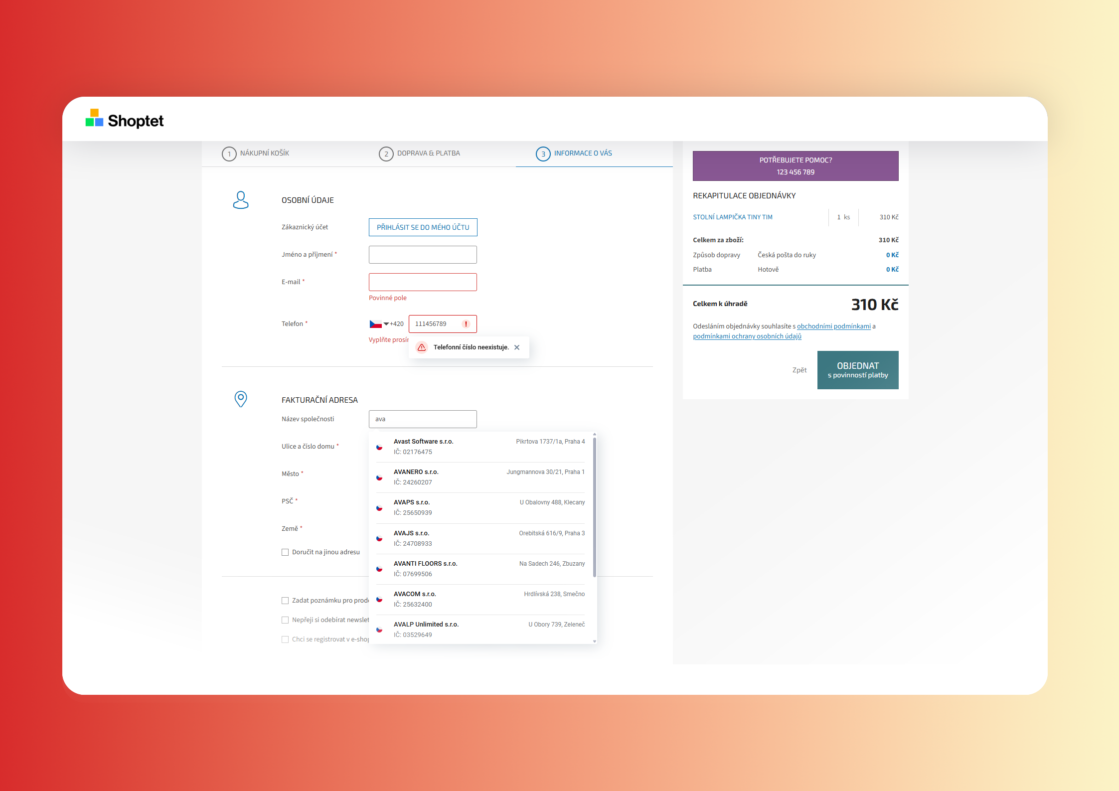 - Vďaka reálnej validácií e-mailov a telefónov zamedzí chybám v objednávke