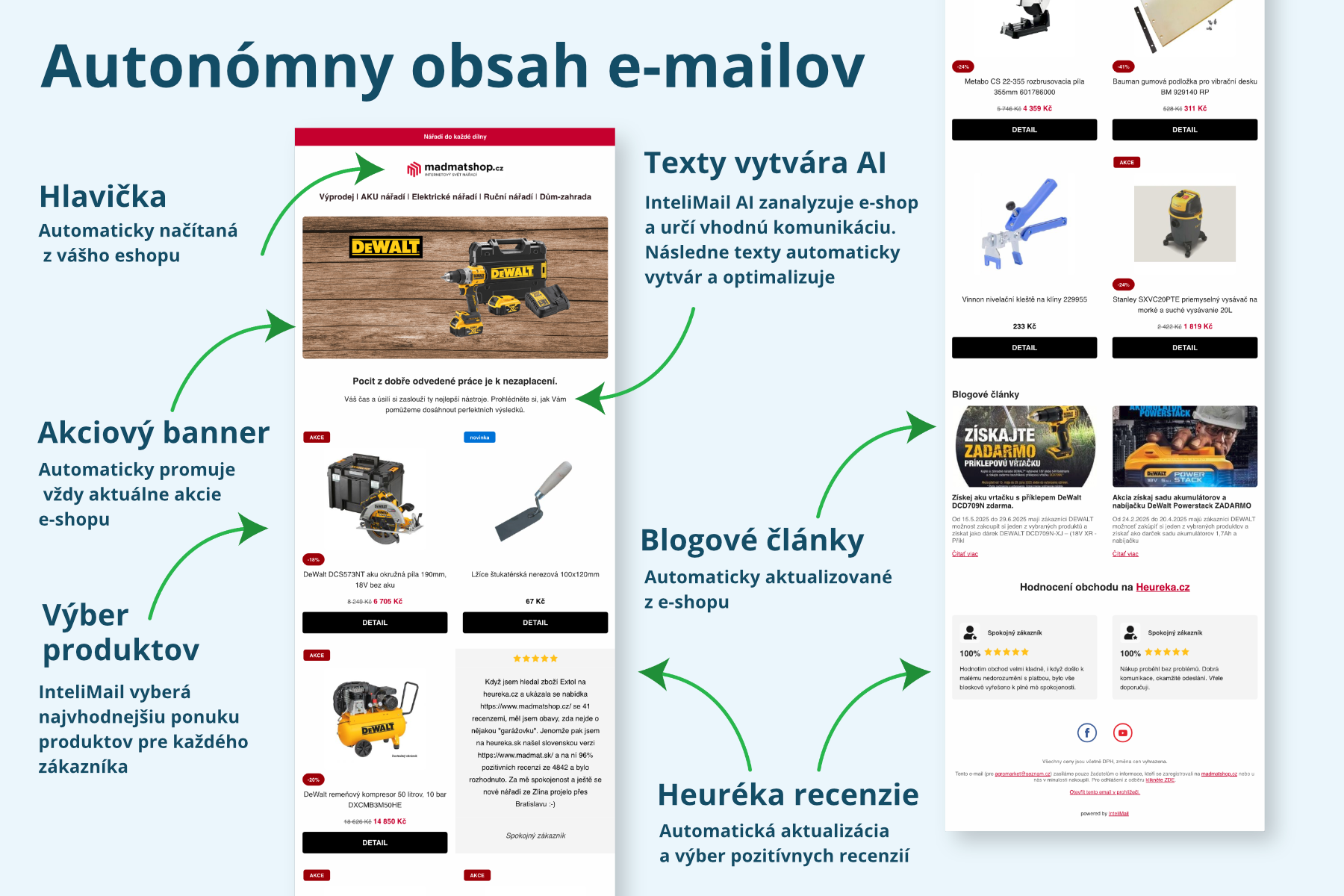 InteliMail personalizuje nielen meno zákazníka. Každý e-mail sa prispôsobuje podľa dát - pohlavia, histórie nákupov, bonity, návštevnosti, opakovaných nákupov či aktuálneho správania na e-shope. Na základe týchto údajov sa dynamicky volí text, banner, odporúčané články a hlavne produkty, aby zákazník dostal obsah, ktorý ho skutočne zaujíma.