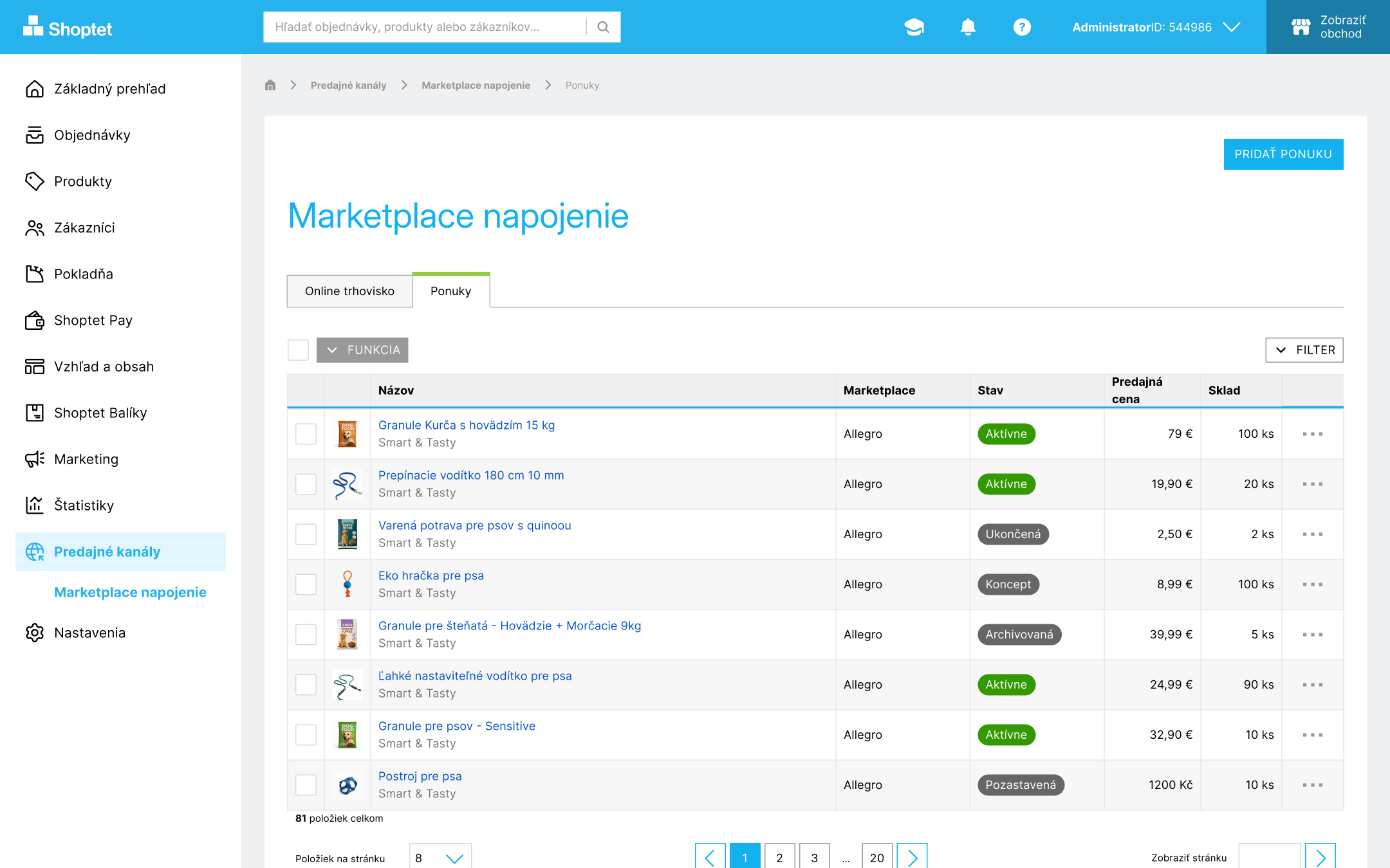 V administrácii vidíte aktívne aj neaktívne ponuky, prípadné upozornenia a stav napojenia jednotlivých marketplaces. Všetko spravujete z jedného miesta bez nutnosti využívať externé nástroje alebo riešiť technicky náročné prepojenie.