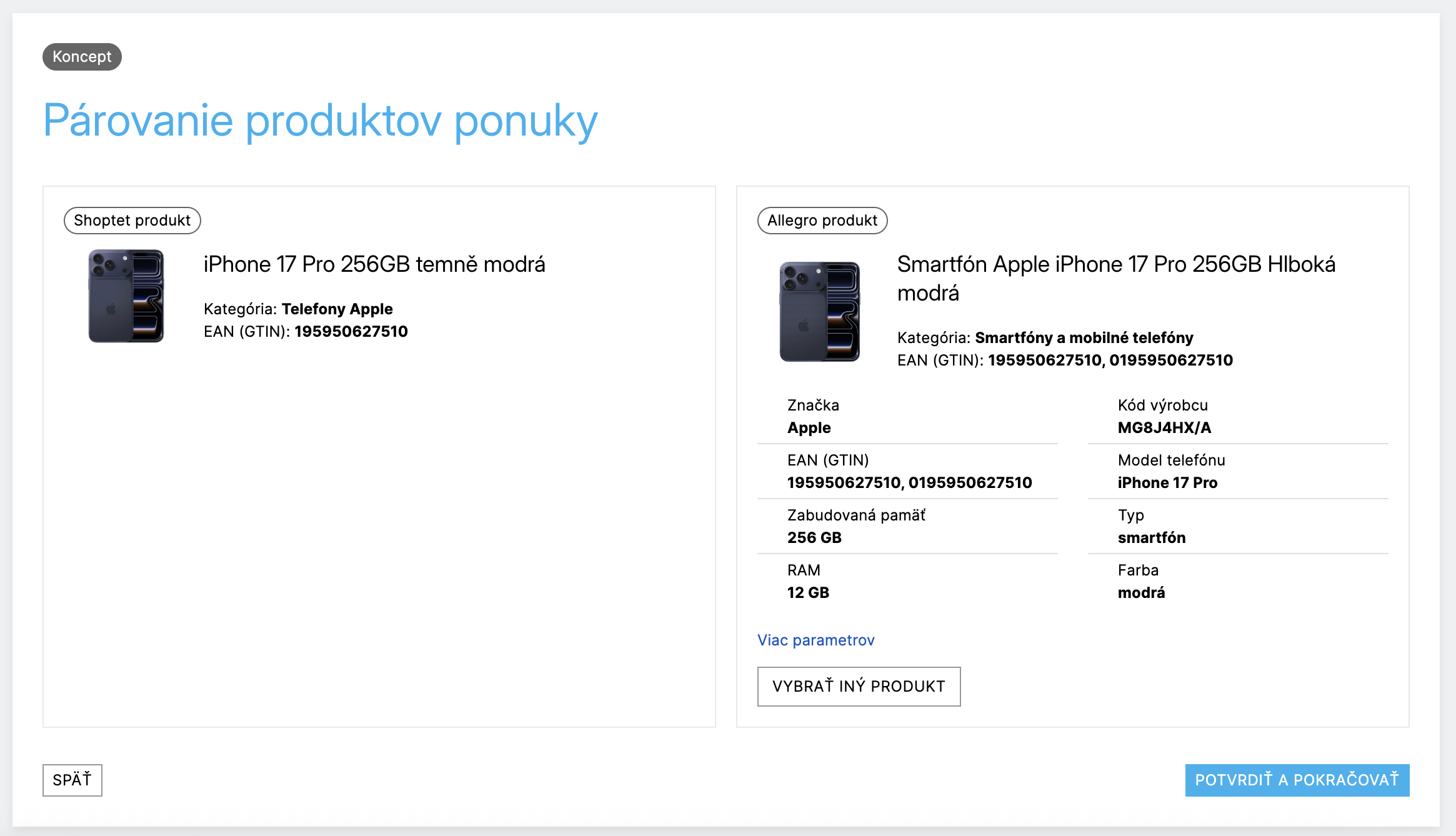 - Automaticky párovať produkty podľa EAN, GTIN alebo názvu