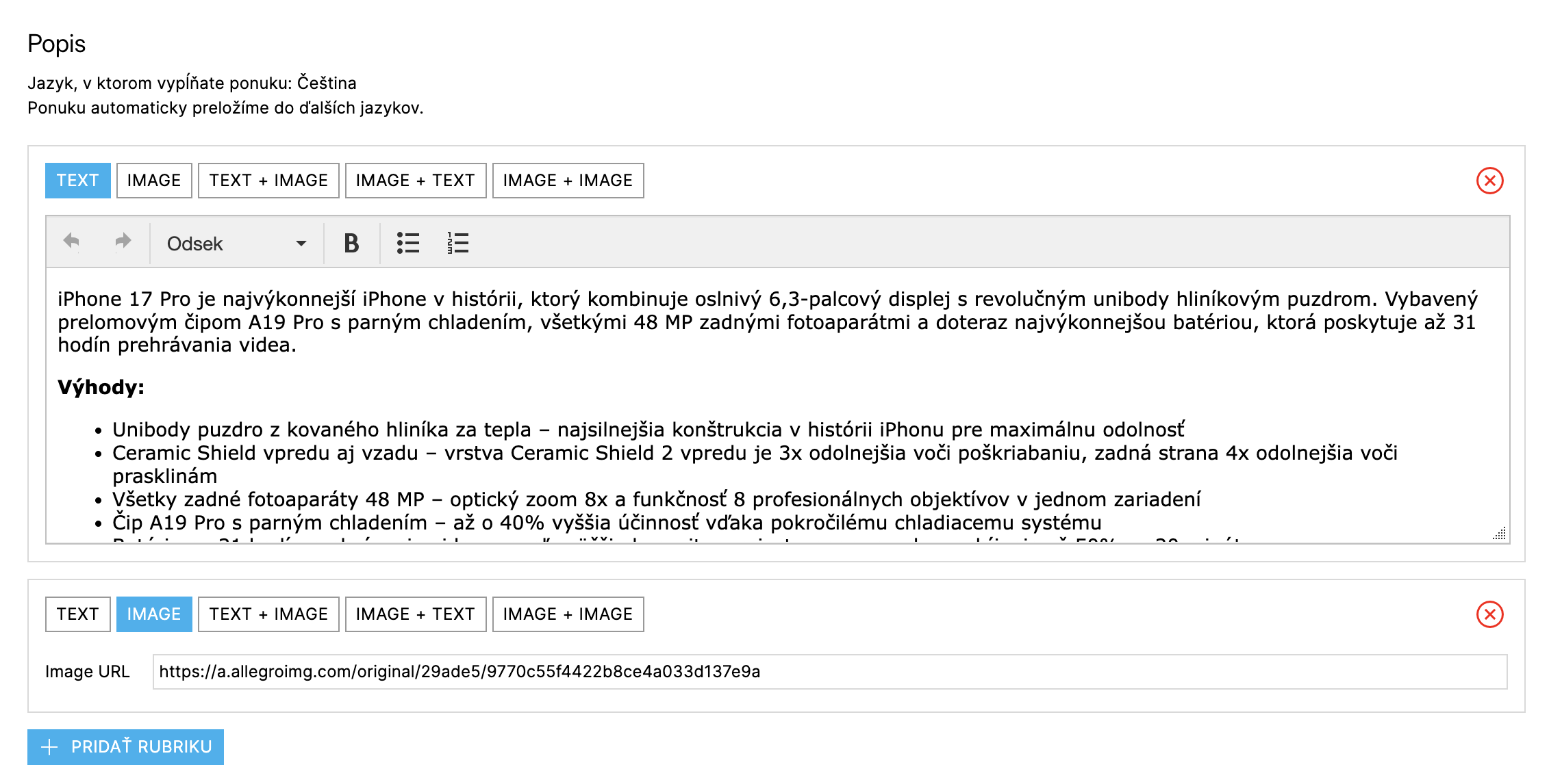 Predvolené nastavenia ponúk, validácia dát pred odoslaním a automatické párovanie na katalóg marketplace šetria čas a znižujú chybovosť pri vystavovaní produktov.