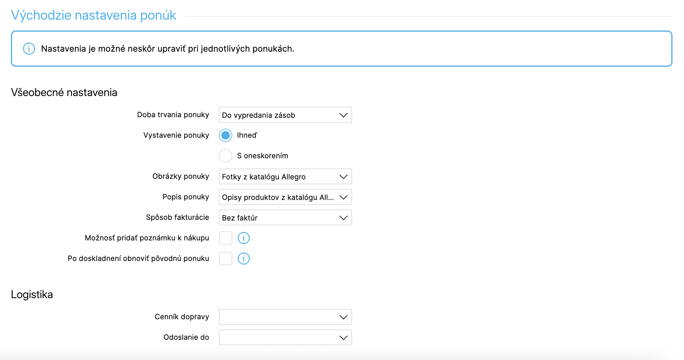 - Nastaviť predvolené parametre ponúk na automatické predvyplnenie pri vystavení každej novej ponuky
