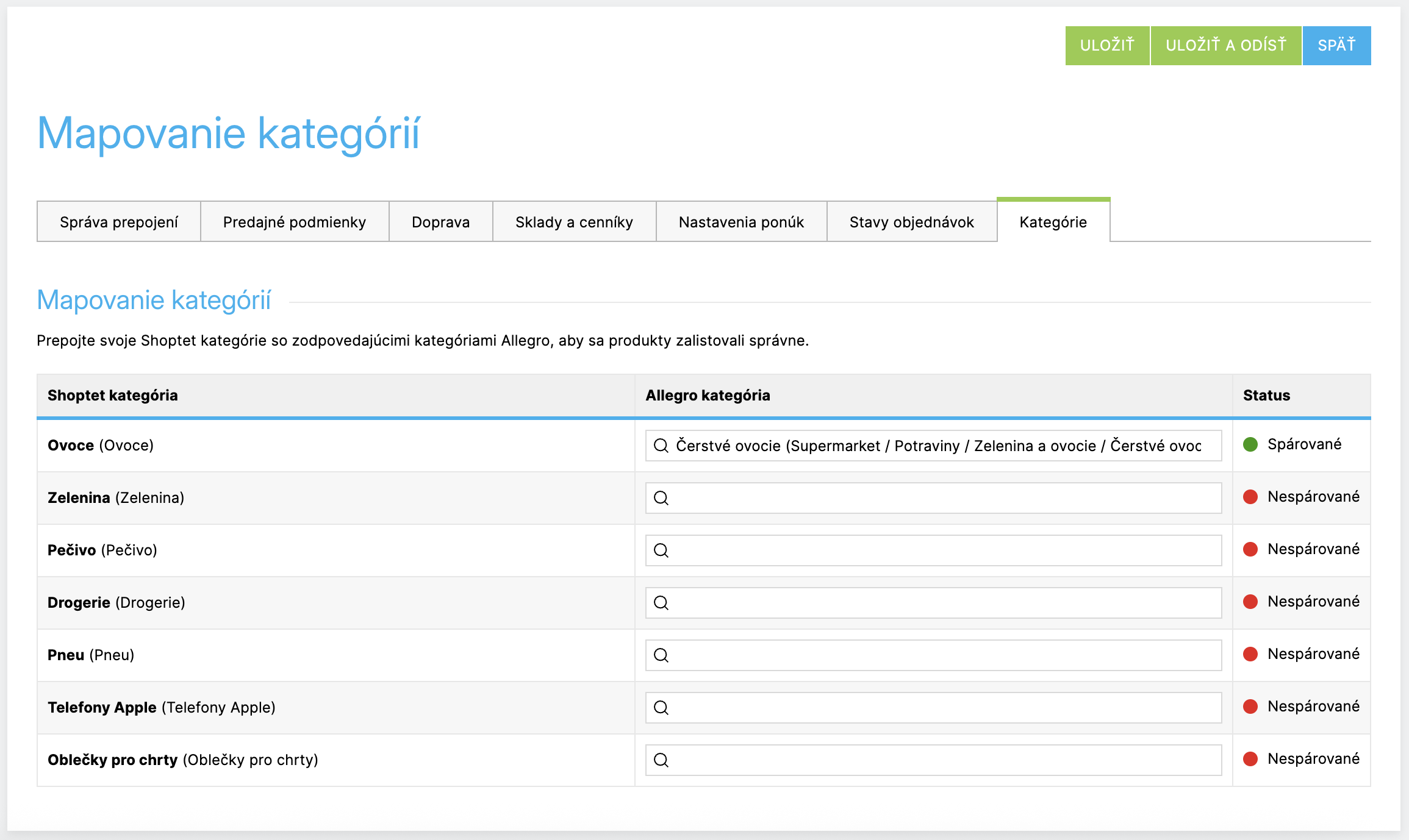 - Mapovať kategórie z e-shopu do kategórií marketplace