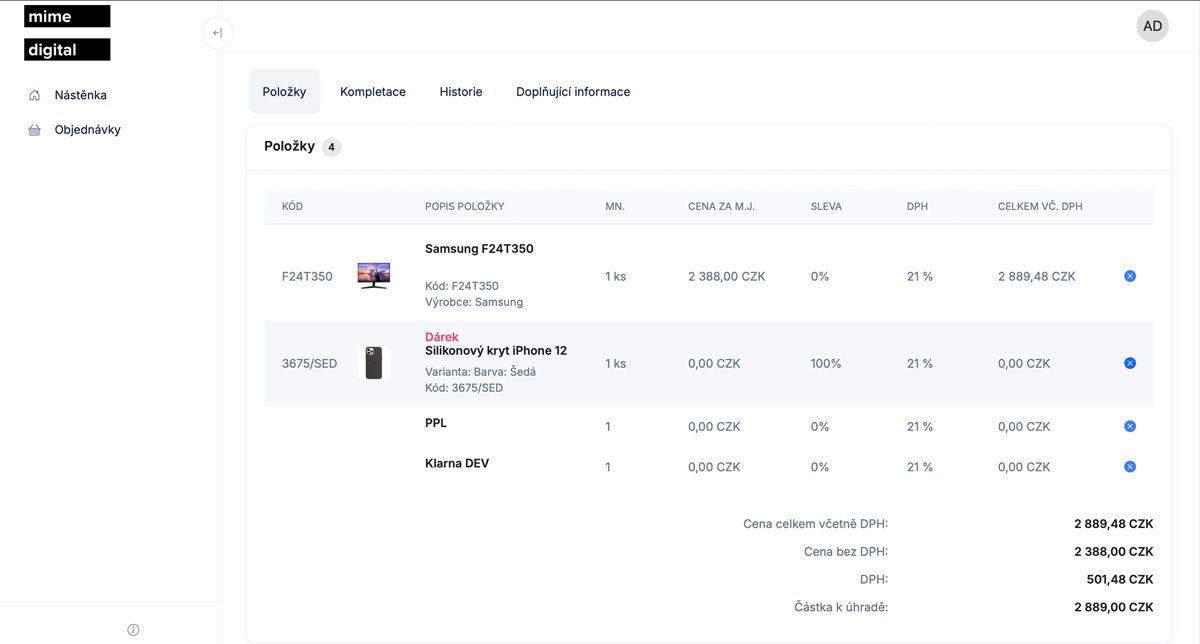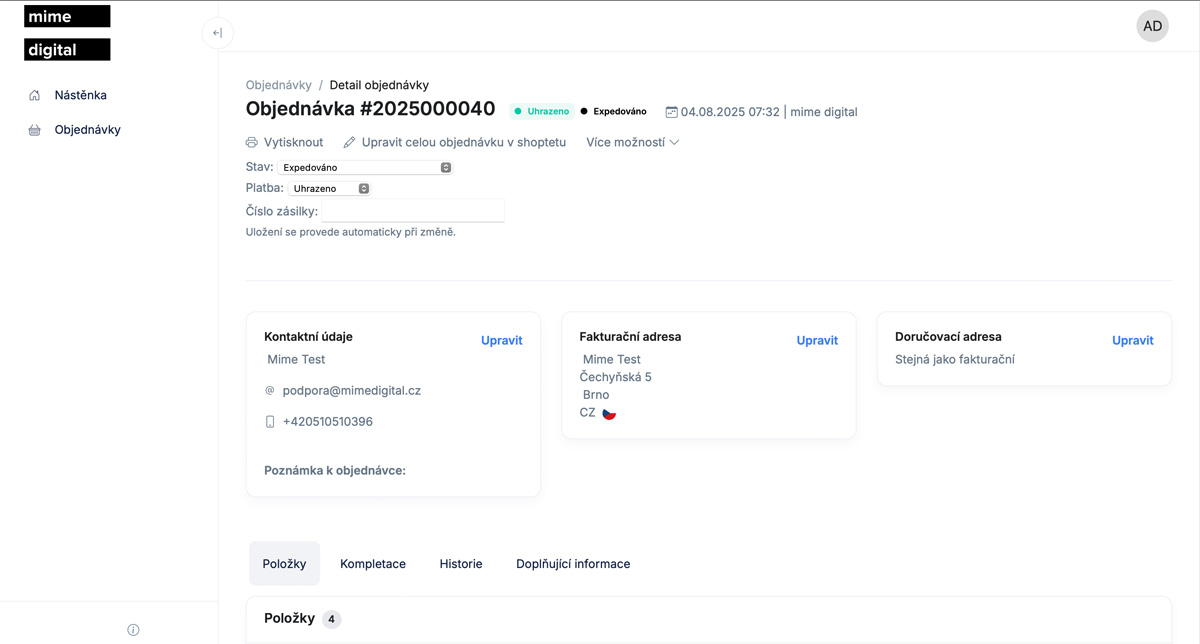 - Detailný prehľad objednávky vrátane položiek, histórie, adries a doplňujúcich informácií