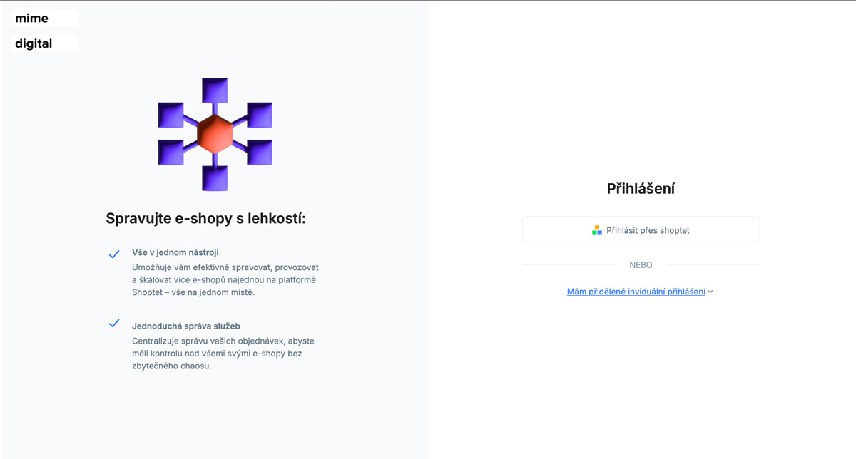 Do aplikácie sa jednoducho prihlásite cez Shoptet – teda rovnakými údajmi, aké používate pre svoj e-shop. Overenie prihlásenia prebieha priamo na strane Shoptetu, čo zaručuje vyššiu bezpečnosť a nulovú potrebu ďalších hesiel.