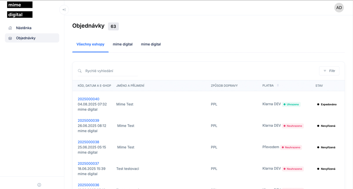 - Pokročilé filtrovanie a vyhľadávanie podľa e-shopu, stavu, platby, dopravy alebo zákazníka
