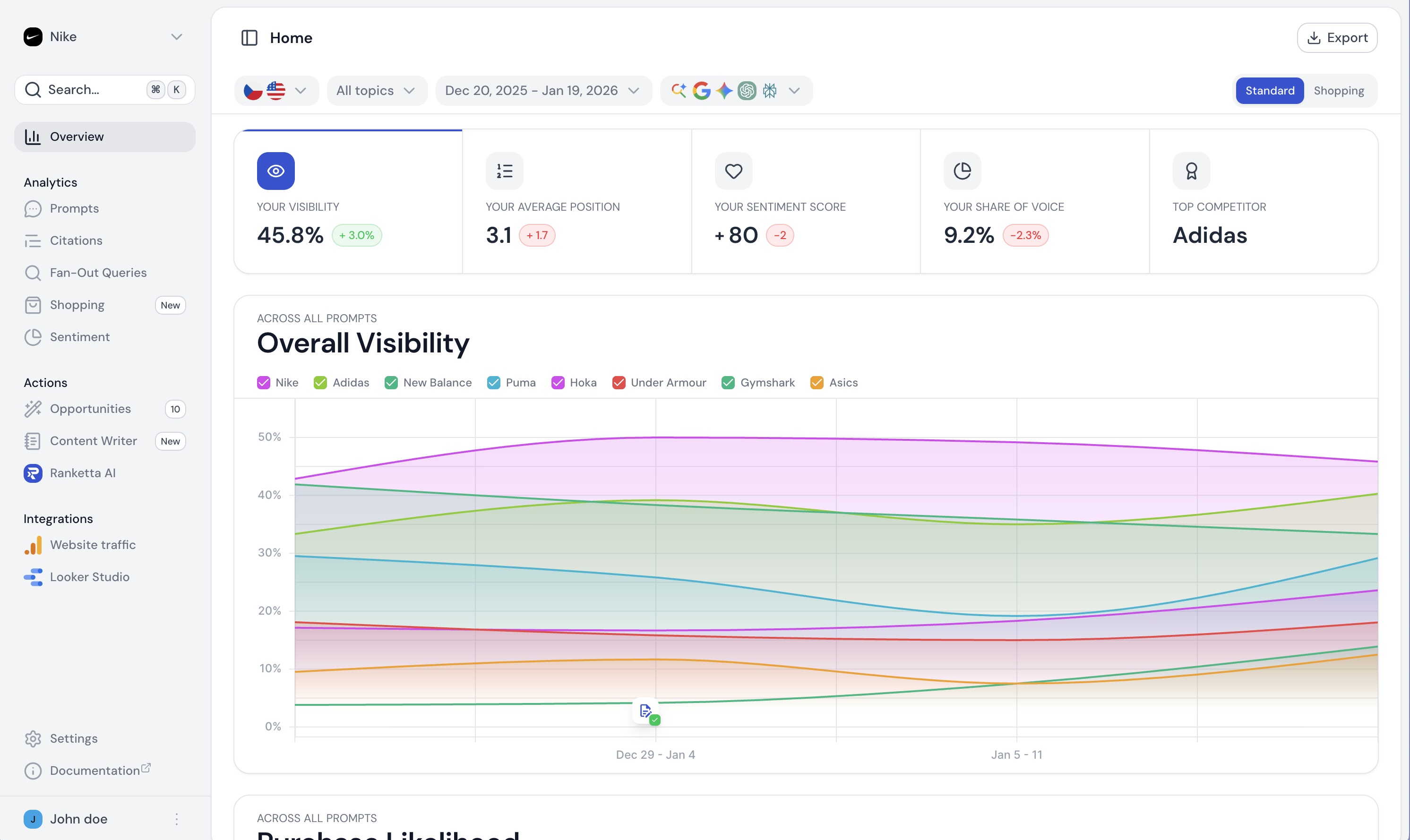 Ranketta pomáha e-shopom pochopiť, ako sú ich produkty viditeľné a odporúčané v AI nástrojoch (ChatGPT, Perplexity, Google AI Overview atď.) a ukazuje, čo konkrétne zlepšiť, aby sa vaše produkty zobrazovali častejšie. Na rozdiel od iných nástrojov sleduje viditeľnosť na úrovni jednotlivých produktov a SKU, nielen značky, a pracuje s reálnymi dátami z AI rozhraní presne tak, ako ich vidí váš zákazník.