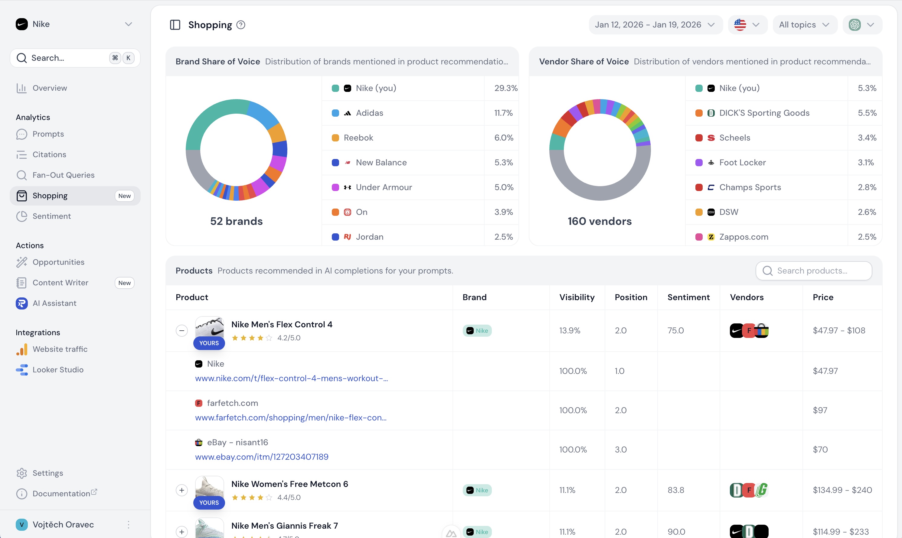 - Product-level tracking: Sledovanie na úrovni konkrétnych produktov a SKU, nielen značky. Väčšina konkurenčných nástrojov to nedokáže.