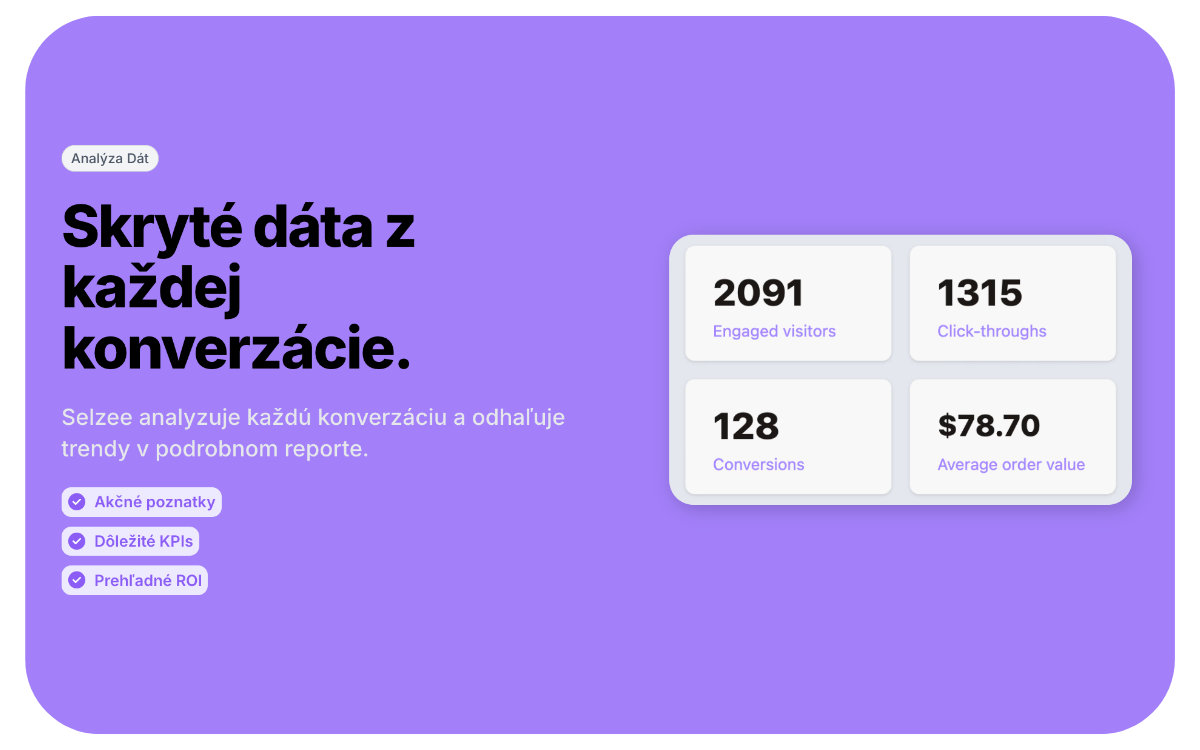 - Dáta a reporting – prehľad o výkonnosti, odporúčaniach, konverziách, AOV, ROI