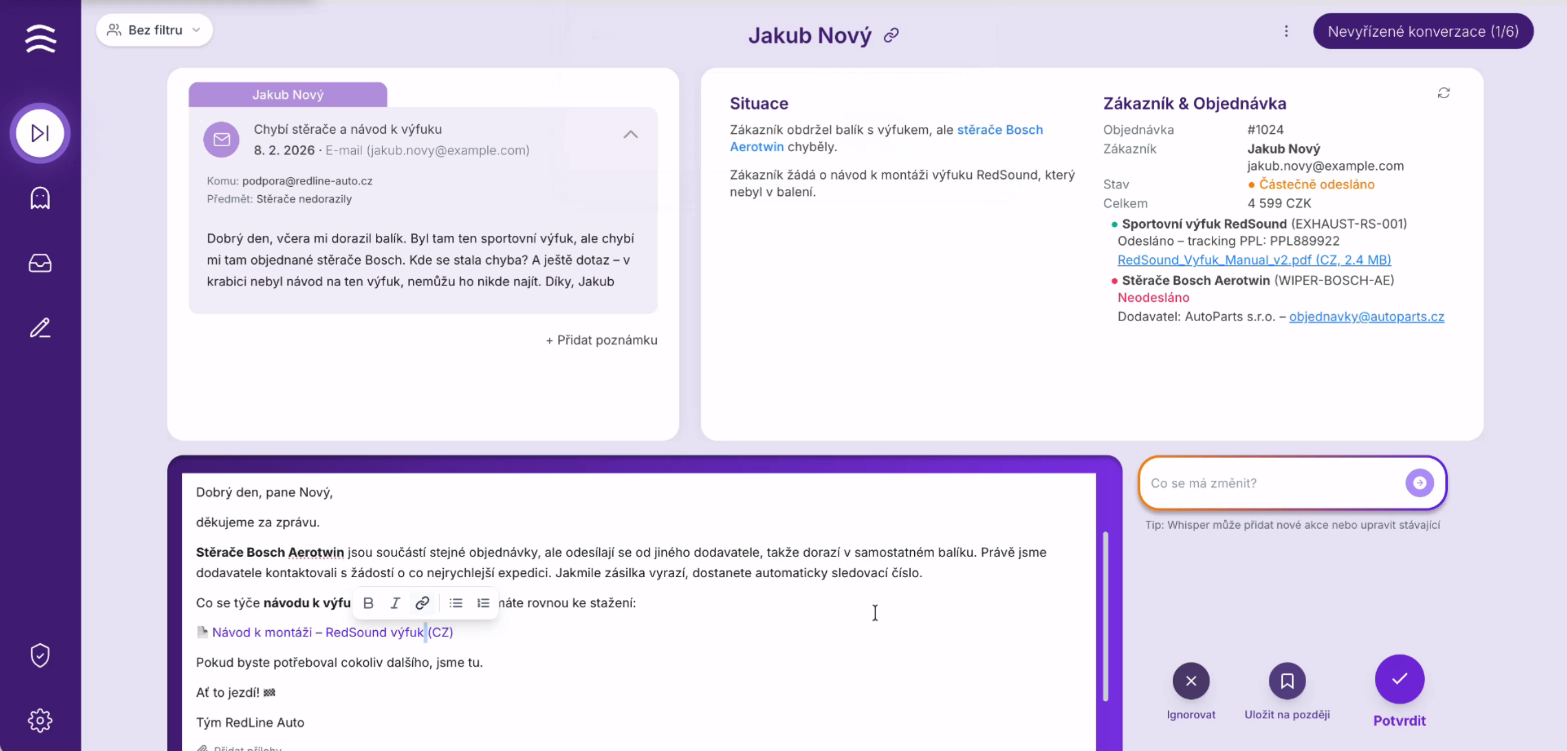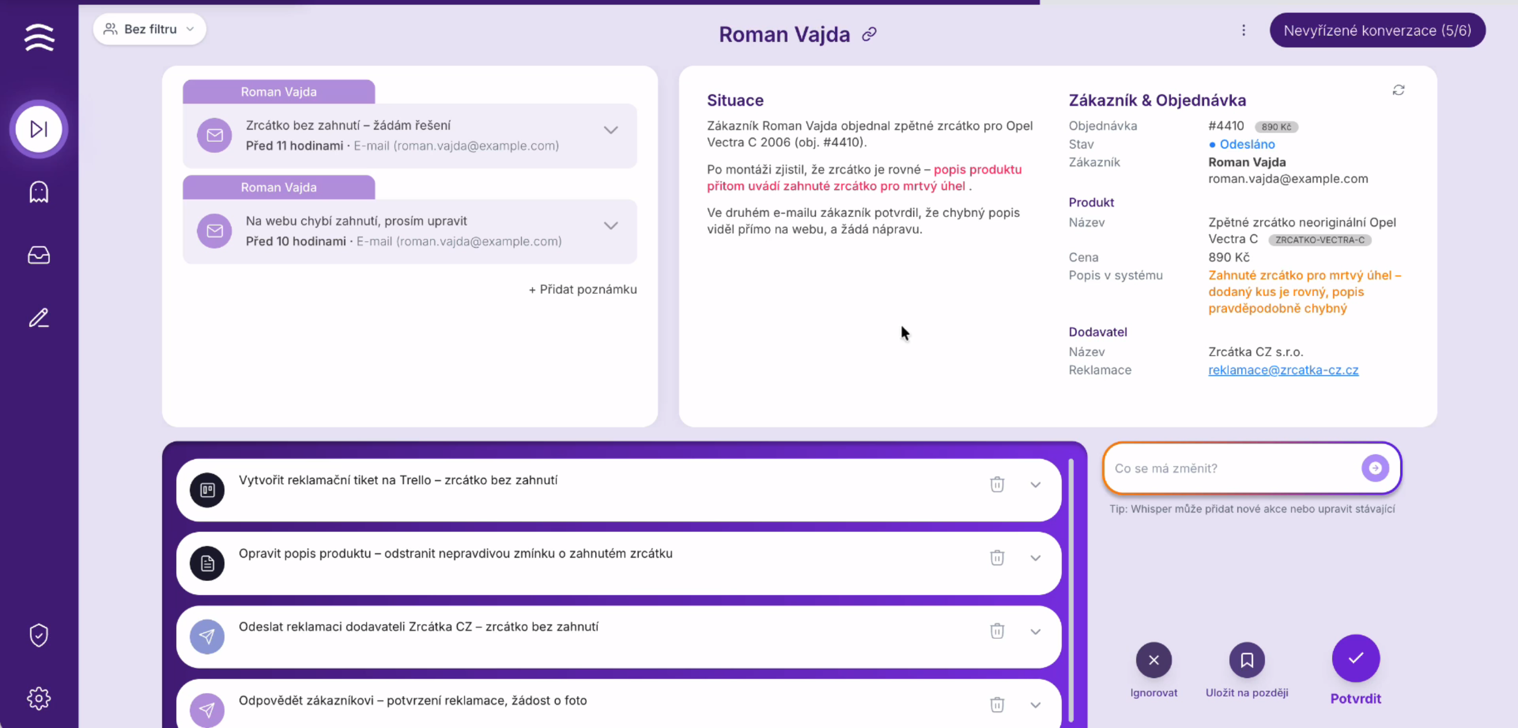 Po schválení ľudským operátorom dokáže samostatne vykonávať vybrané akcie priamo v administrácii e-shopu (napr. úpravu objednávky)